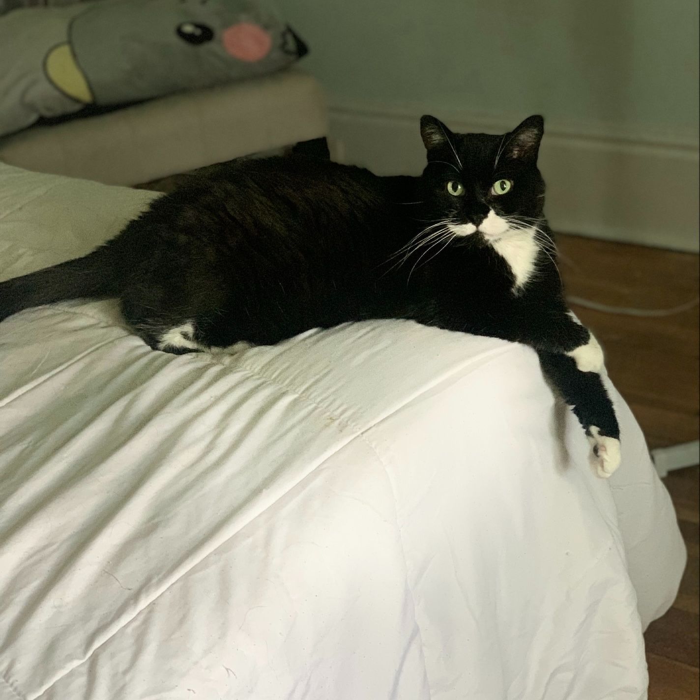 Likes: cheese, sitting on your head, licking beards, stalking people, attacking feet, biting hands, snuggling (on his terms only) and naps, lots of naps
